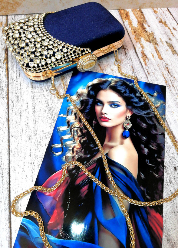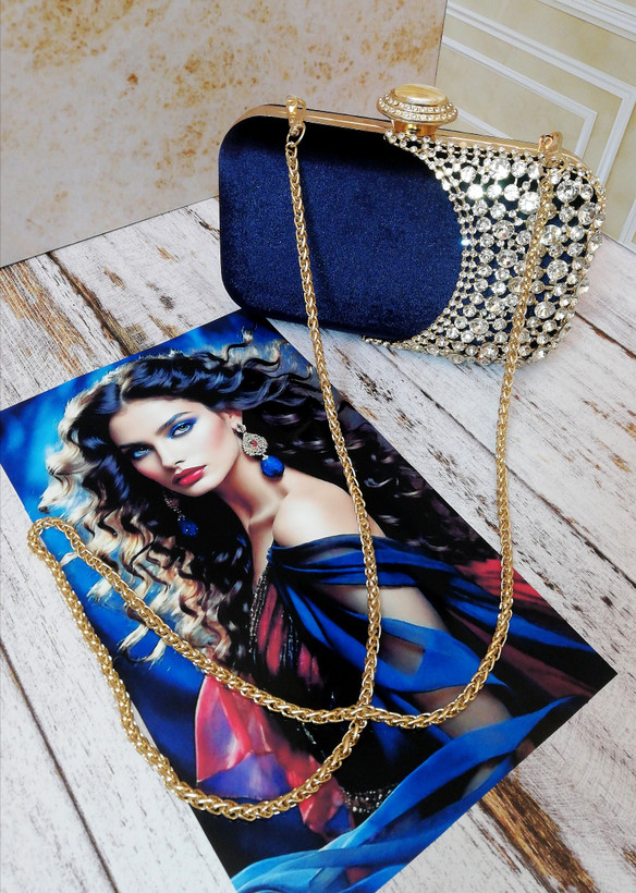 کیف زنانه و دخترانه فوق لاکچری، دستدوز، شخصی دوز، مجلسی (کلاچ)، جنس پارچه روی کیف مخمل(سورمه ای) روکش شده با قاب نگینی، طرح قفل کیف سنگ مرمر دور نگینی، به همراه زنجیر بلند دوشی، متریال و یراق آلات وارداتی و رنگ ثابت، استحکام و کیفیت بالا، طراحی خاص و منحصر به فرد