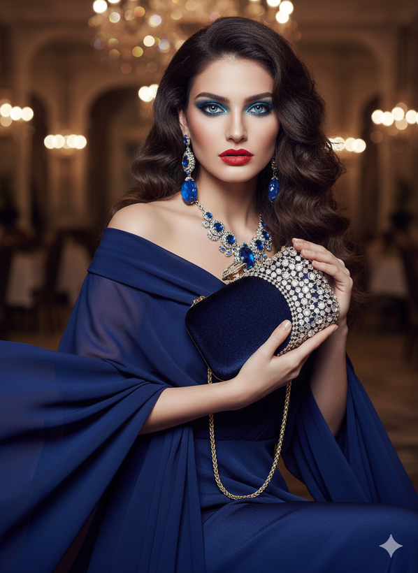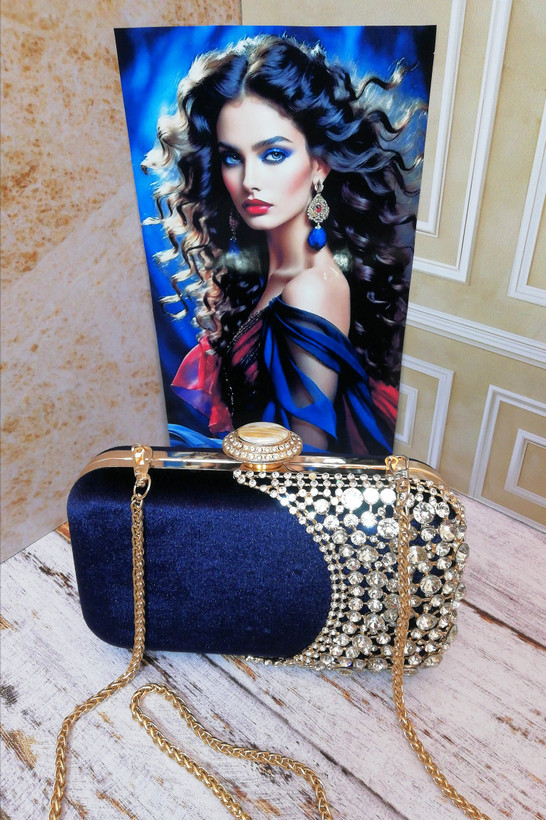 جنس پارچه روی کیف: مخمل (سورمه ای) روکش شده با قاب نگینی
