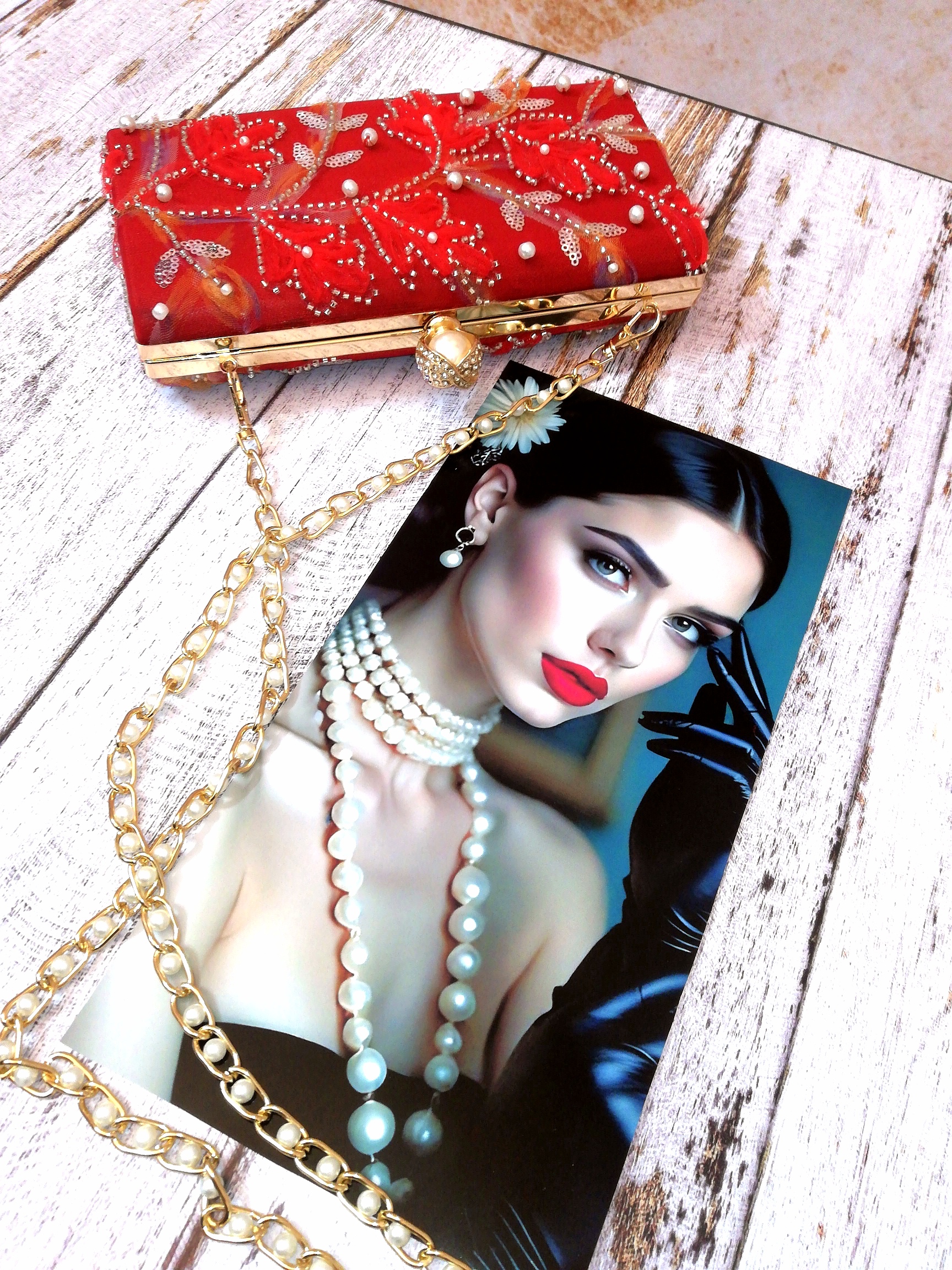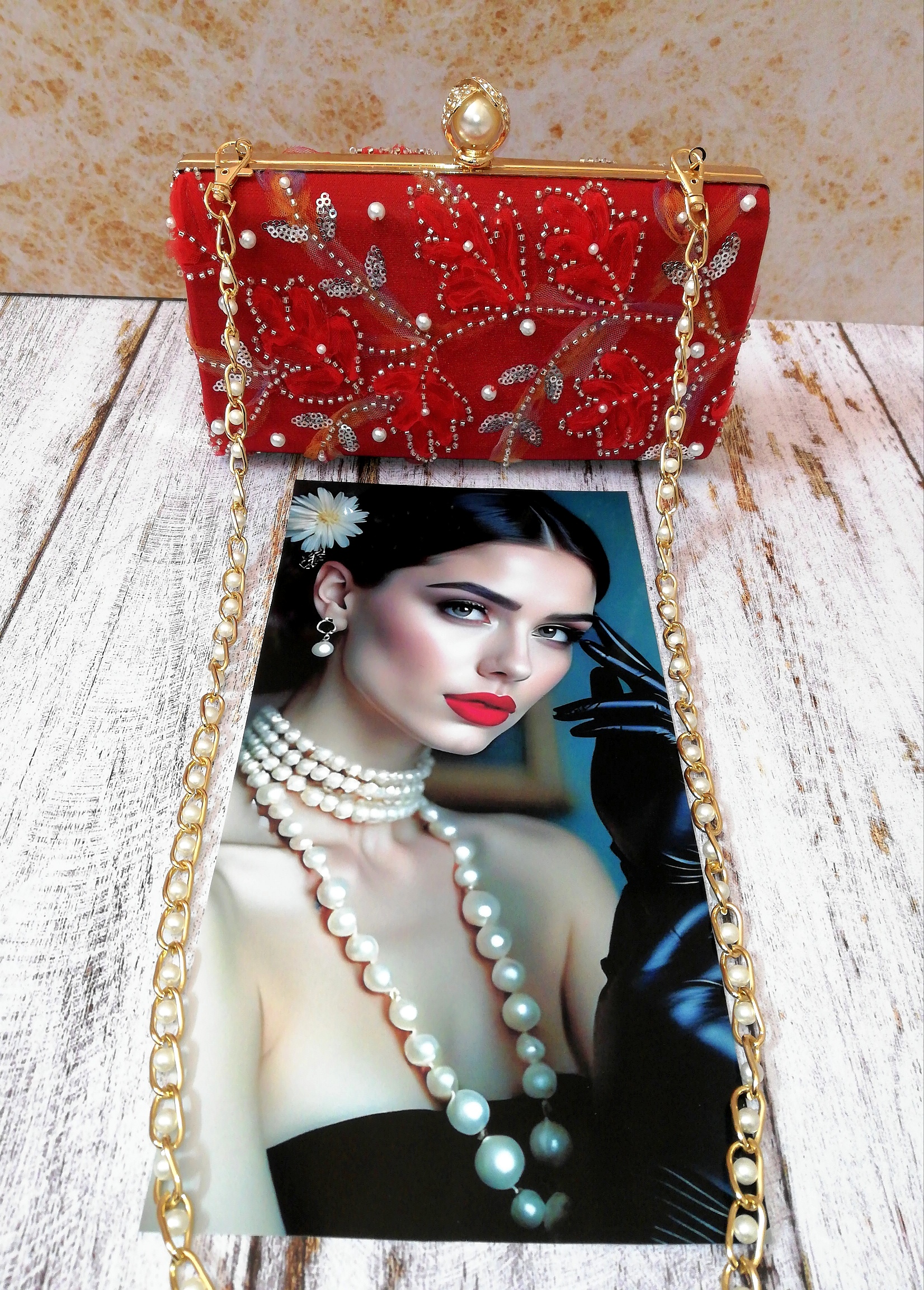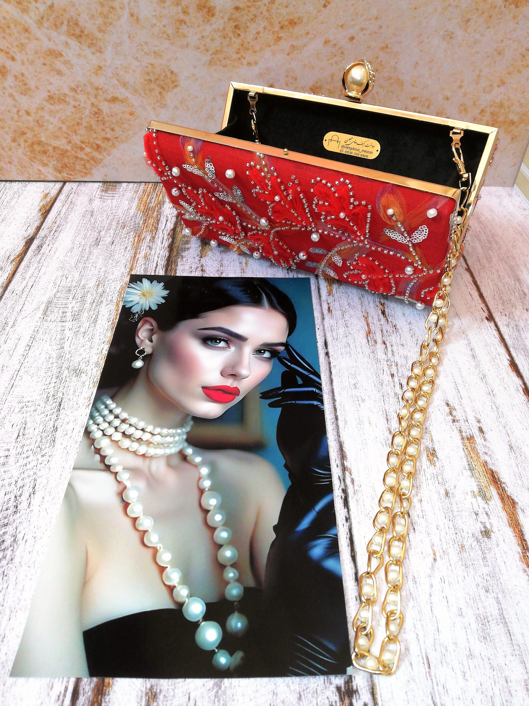 جنس پارچه روی کیف: تور گل برجسته کارشده با پولک و منجوق و مروارید