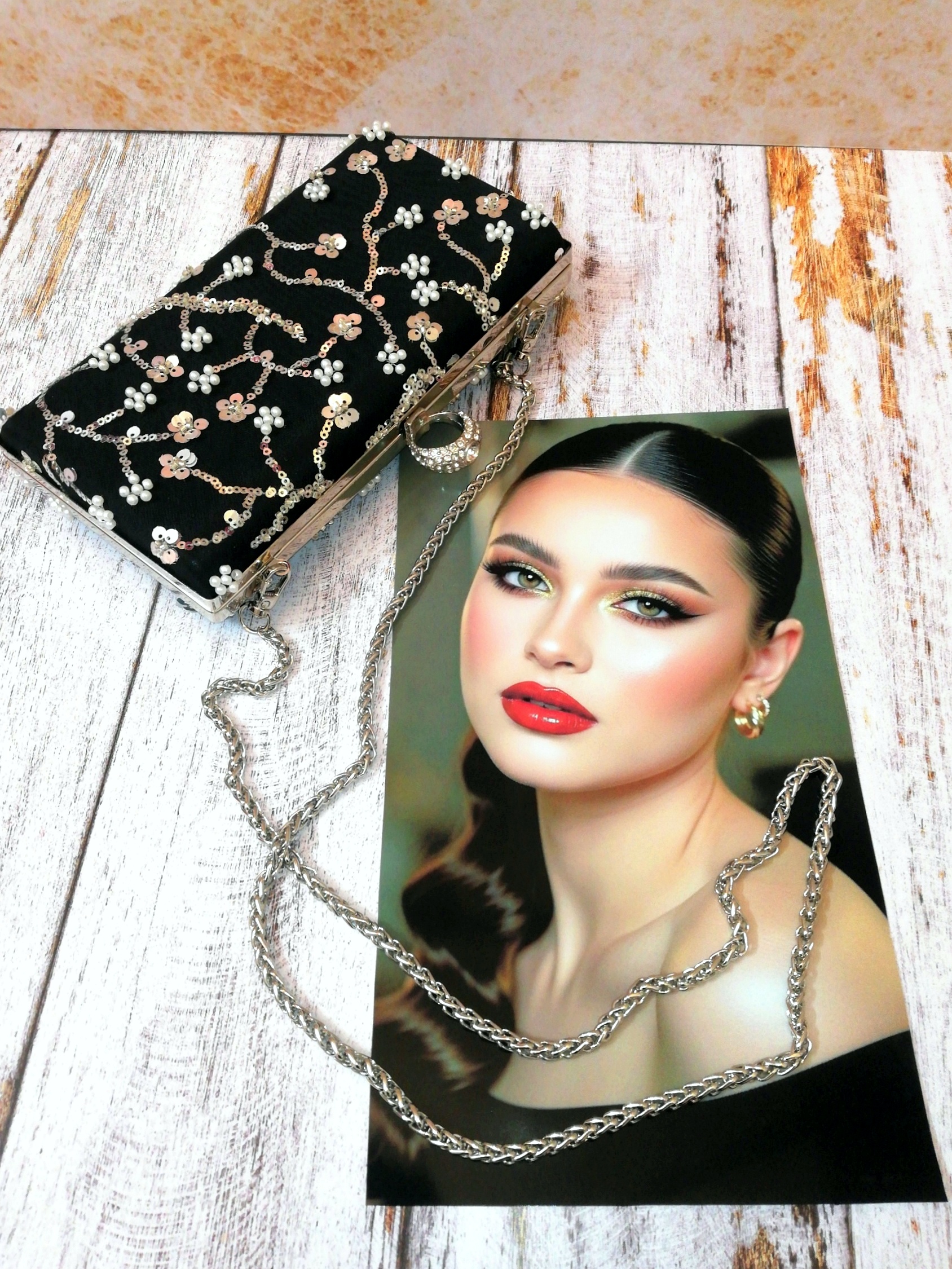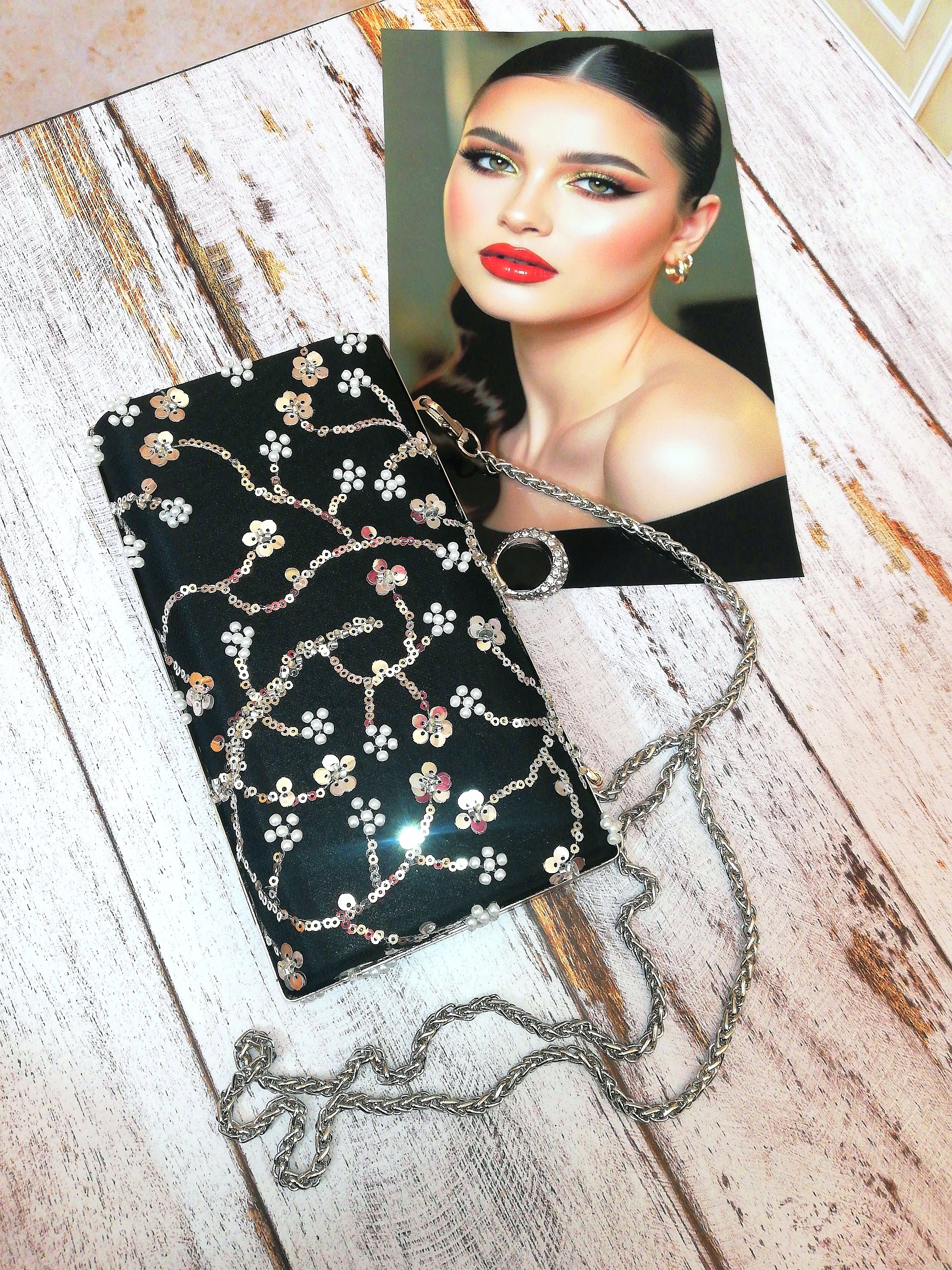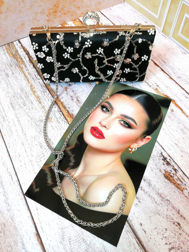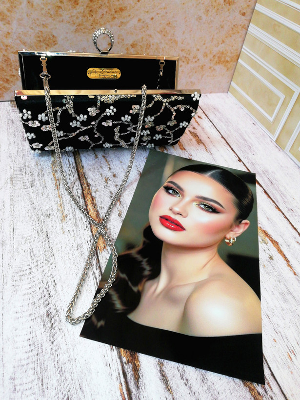 کیف زنانه و دخترانه، دستدوز، شخصی دوز، مجلسی(کلاچ)، جنس پارچه روی کیف تور کار شده با پولک و منجوق و مروارید، آستر داخل کیف اشبالت (مشکی)، قابل سفارش در دو رنگ قاب کیف (طلایی و یا نقرهای)، طرح قفل کیف انگشتری نگیندار، به همراه زنجیر بلند دوشی، متریال و یراق آلات وارداتی و رنگ ثابت، استحکام و کیفیت بالا، طراحی خاص و چشمگیر، کاملا جادار و کاربردی
