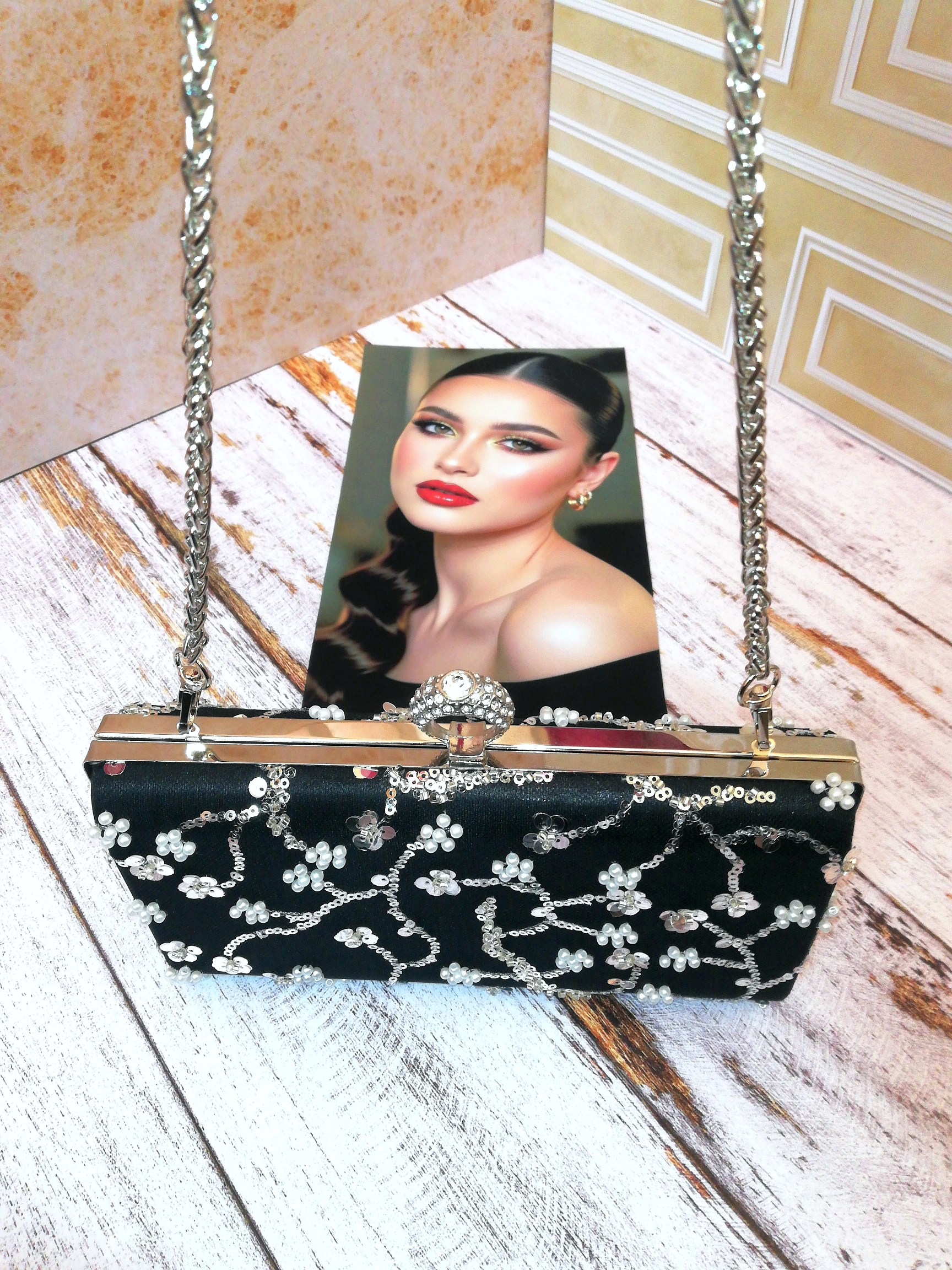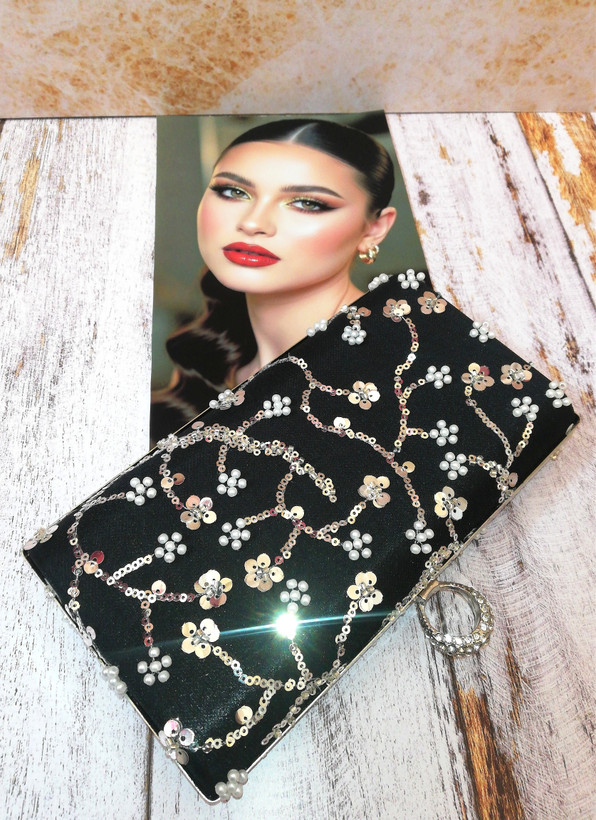 جنس پارچه روی کیف: تور کارشده با پولک و منجوق و مروارید