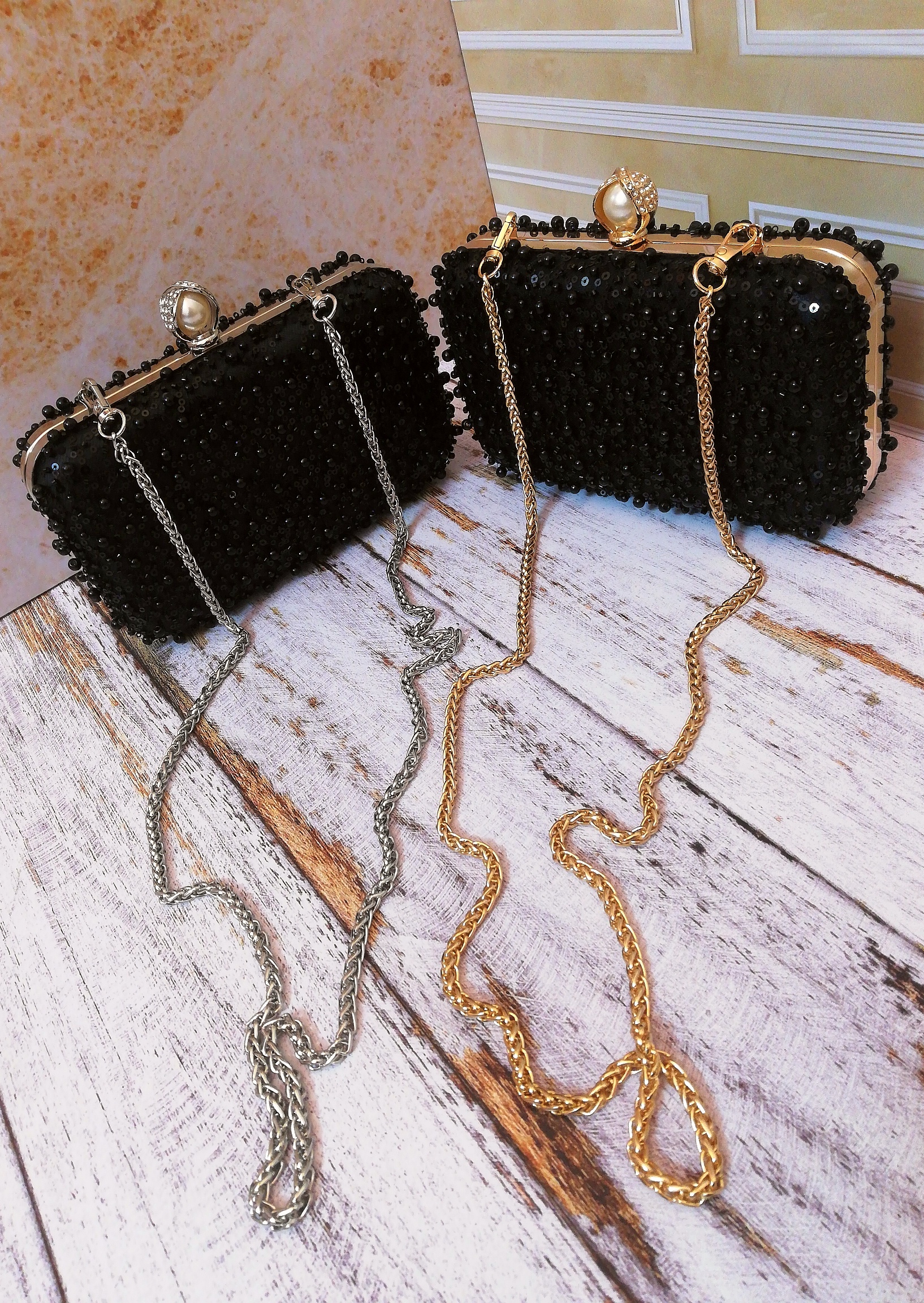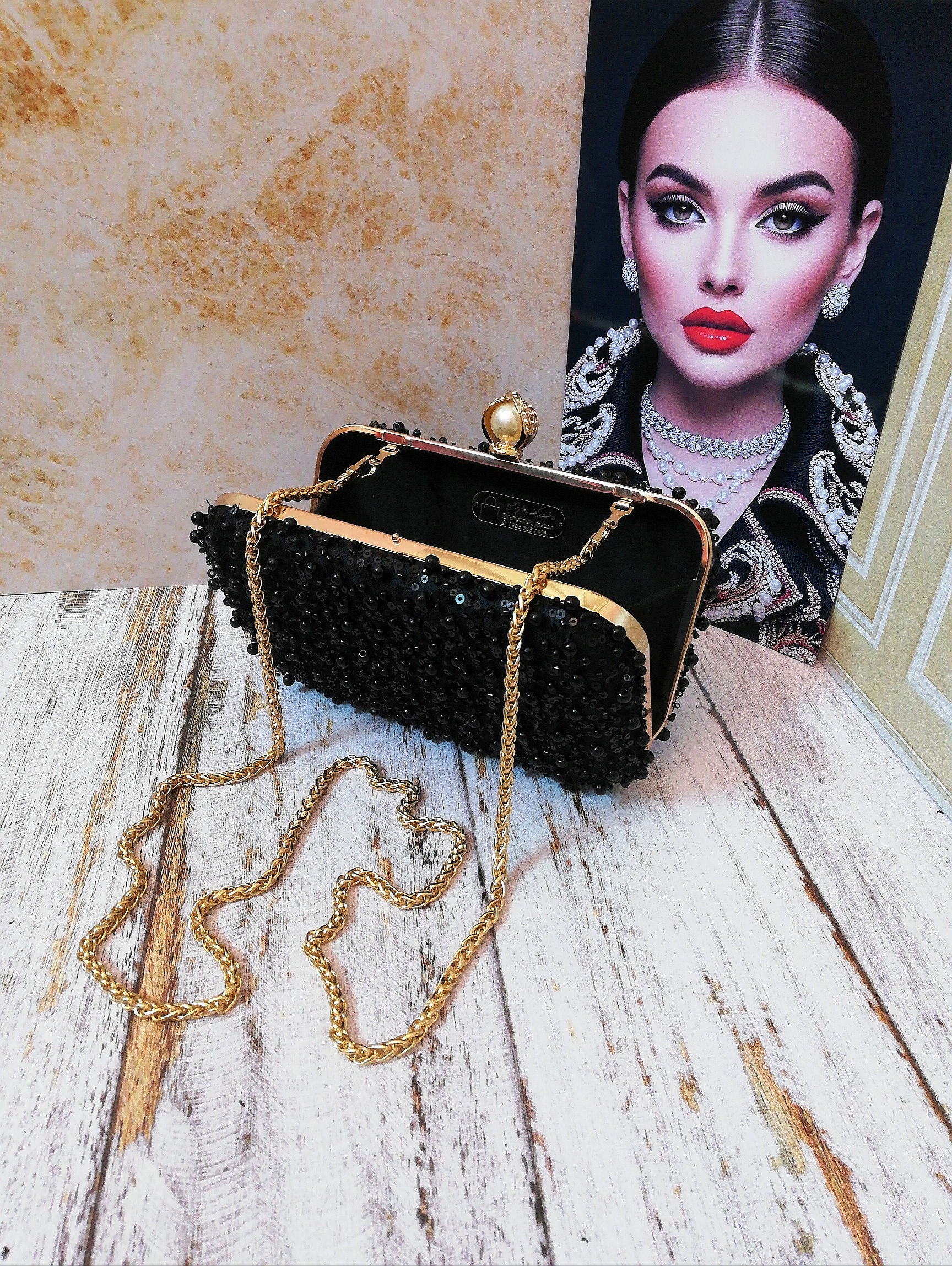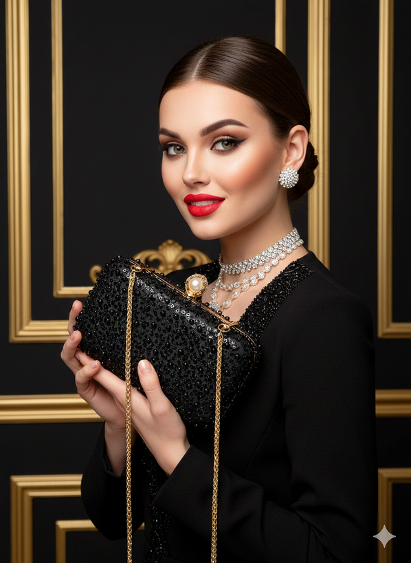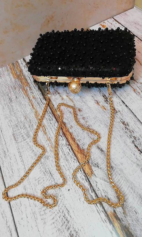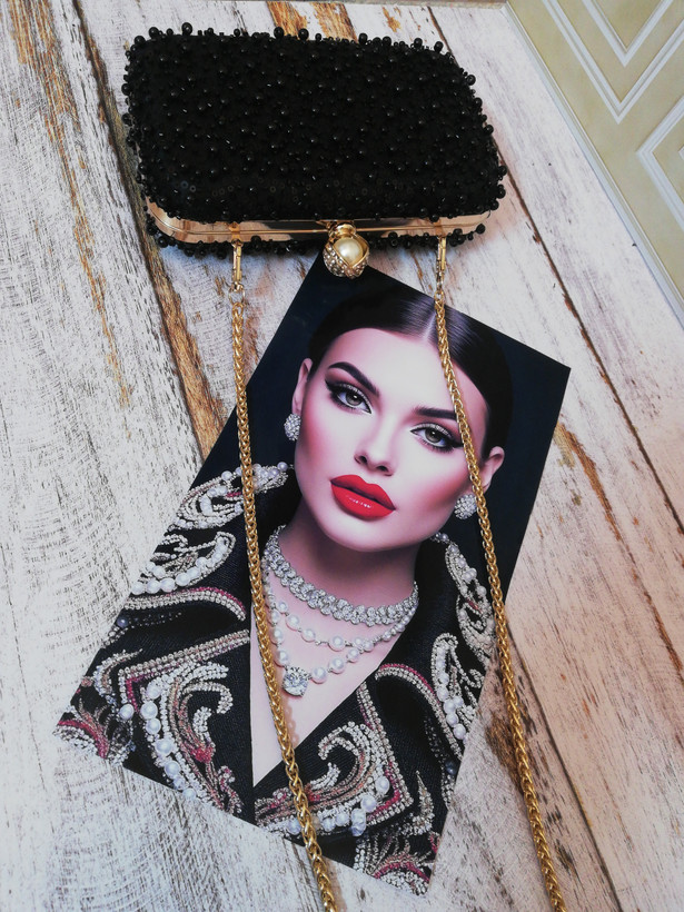 کیف زنانه مجلسی دست‌دوز و دست ساز جنس پارچه تور کارشده با مروارید و منجوق و پولک
